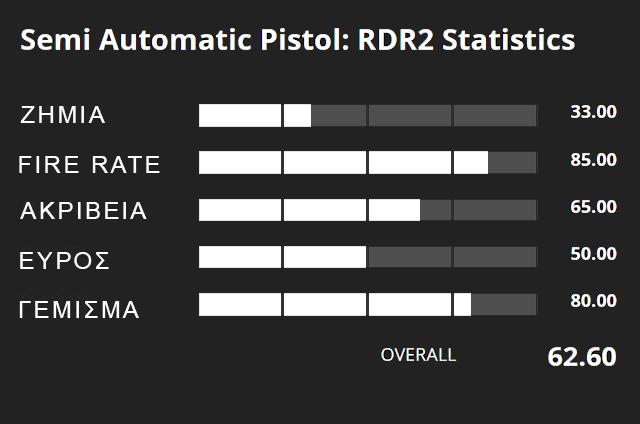 Το Semi Automatic Pistol είναι ένα όπλο στην κατηγορία Pistols που παρουσιάζεται παρουσιάζεται αντίστοιχα και στο Red Dead Redemption 2 και Red Dead Online.