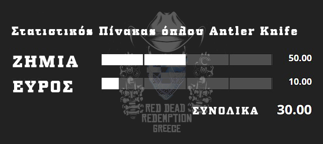 Το Antler Knife στο RDR2 μπορεί να αποκτηθεί μόνο κάπου στον χάρτη, βρίσκεται σε μια νεκρή αρκούδα σε μικρή απόσταση στα βορειοδυτικά του Ranch Hanging Dog (Big Valley, West Elizabeth). Δεν μπορεί να αγοραστεί.