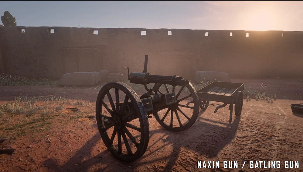 Τρία όπλα Gatling μπορούν πάντα να βρεθούν τοποθετημένα μέσα στο El Presidio. Αυτό το όπλο χρησιμοποιείται συνήθως από τον Μεξικανικό Στρατό στην εκστρατεία του εναντίον των ανταρτών. Το Gatling Gun που χρησιμοποιήθηκε στην αποστολή «The Assault on Fort Mercer» λέγεται ότι είναι ένα κυβερνητικό όπλο, υποδηλώνοντας ότι ο αμερικανικός στρατός είχε εγκρίνει το όπλο σε κάποιο σημείο. Εντός παιχνιδιού, ωστόσο, ο στρατός των ΗΠΑ χρησιμοποιεί το σύγχρονο Browning Gun, πιθανότατα σημαίνει ότι έβλεπαν το Gatling Gun απαρχαιωμένο σε σύγκριση.