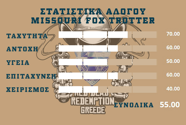 Το τρίχωμα Amber Champagne μπορείτε να το βρείτε στον στάβλο Scarlett Meadows, ενώ το Silver Dapple Pinto στο στάβλο Blackwater. Και τα δύο έχουν υψηλή βασική αξία 950 $. Τα Missouri Fox Trotters είναι μια διασταύρωση μεταξύ ενός αλόγου κούρσας και εργασίας, επομένως έχουν μέτρια χαρακτηριστικά και υψηλότερη ταχύτητα. Ο χειρισμός του του δίνει μέτρια αντιδραστικότητα και ευελιξία.