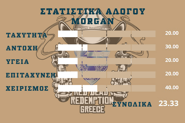 Τα Morgan ταξινομούνται ως άλογα ιππασίας. Μπορούν να αναγνωριστούν από το μικρότερο πλαίσιο, την εκλεπτυσμένη κατασκευή και το κομψό τους βάδισμα. Όλοι οι τύποι τριχώματος μπορούν να κλαπούν ή να εξημερωθούν από την άγρια φύση, ενώ το Bay Roan μπορεί να αγοραστεί από τους στάβλους. Το Palomino μπορεί να αγοραστεί από το στάβλο Amos Levi Blacksmith & Farrier στο Valentine, αν και μόνο κατά τη διάρκεια της αποστολής «Exit Pursued by a Bruised Ego» και σε πολύ φθηνότερη τιμή των $15, σε σύγκριση με τα συνηθισμένα $55.