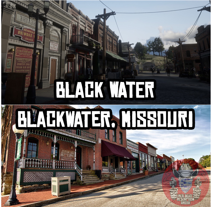 Στο Red Dead Redemptiom 2 το Blackwater είναι μία μικρή πόλη στην πολιτεία της West Elizabeth. Αυτή η πόλη τέθηκε σε περιορισμό από τους Pinktertons μετά από μία μεγάλη σύγκρουση ανάμεσα σε αυτούς και την συμμορία Van Der Linde Gang, γεγονότα τα οποία συνέβησαν πριν την έναρξη του παιχνιδιού. Αυτή η τοποθεσία βασίζεται στην πραγματική πόλη Blackwater στο Μιζούρι (Missouri) η οποία έγινε ένα σημαντικό εμπορικό σημείο τον 19ο αιώνα. Το Blackwater είναι μια πόλη στο βορειοδυτικό Cooper County, Missouri, στις Ηνωμένες Πολιτείες που βρίσκεται κατά μήκος του ποταμού Blackwater, από την οποία παίρνει το όνομά του. Ο πληθυσμός ήταν 162 στην απογραφή του 2010