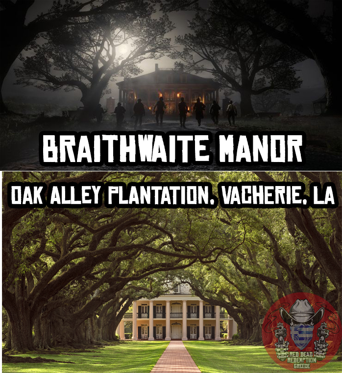 Το Braithwaite Manor στο RDR2 βασίζεται σε μια παλιά φυτεία που υπάρχει ακόμα και σήμερα. Το Oak Alley Plantation χτίστηκε στα μέσα του 19ου αιώνα στο Vacherie, St. James Parish, Λουιζιάνα. Η φυτεία έχει ένα καλυμμένο μονοπάτι από βελανιδιές που ευθυγραμμίζουν την είσοδό του, όμοια με αυτά που μπορούν να προβληθούν στο παιχνίδι. Η φυτεία Oak Valley έχει χαρακτηριστεί ως εθνικό ιστορικό ορόσημο.…