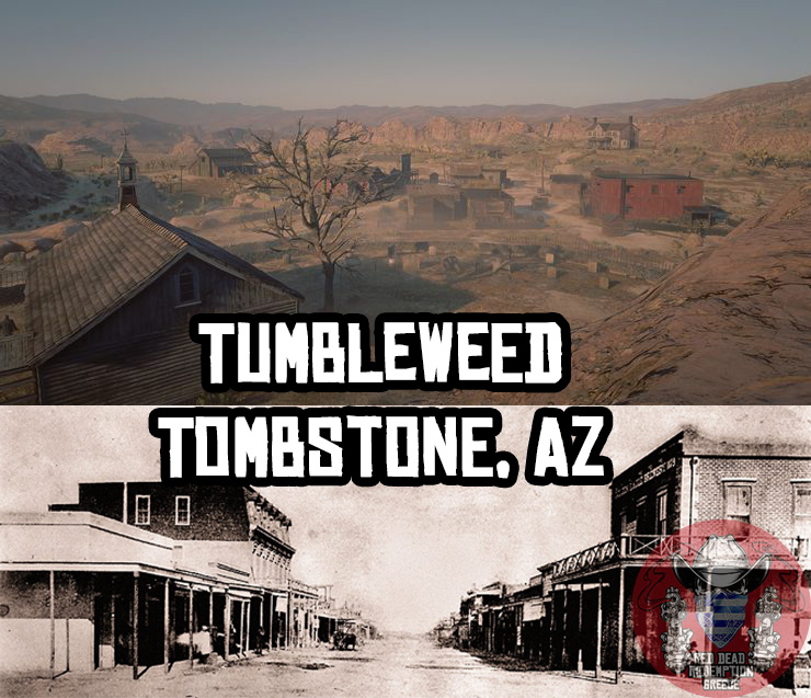 Μία από τις πολλές πόλεις φαντάσματα στην Αμερικανική Δύση είναι και το Tombstone, ένα αρκετά δημοφιλές τουριστικό αξιοθέατο για το Shoutout O.K Corral. Το Tumbleweed στο RDR2 είναι εμπνευσμένο κυρίως από το Tombstone αν και υπάρχουν συγκρίσεις και με την πόλη φάντασμα του Bodie στην έκδοση του Red Dead Redemption. Σύμφωνα με το παιχνίδι, το Tumbleweed εγκαταλείφθηκε για δύο λόγους: ο σιδηρόδρομος που παρακάμπτει μέσω του Armadillo το Tumbleweed μειώνοντας το εμπόριο και οι ληστές με την γενική ανομία προκάλεσαν τους ανθρώπους να απομακρυνθούν.