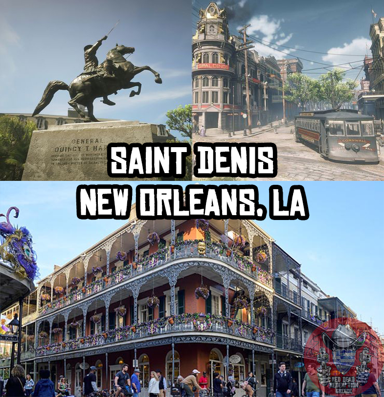 Ίσως η πιο προφανής αναφορά στον πραγματικό ομόλογό του, το Saint Denis στο Red Dead Redemption 2 είναι ένα αρκετά καλό αφιέρωμα στη Νέα Ορλεάνη. Τραμ, αναφορά της Γαλλικής Συνοικίας, Bourbon Street, ο καθεδρικός ναός του Saint Louis, όλες αυτές οι αναφορές του παιχνιδιού. Από τις πιο εικονικές αναφορές είναι το νεκροταφείο της πόλης καθώς και το άγαλμα του Andrew Jackson στην ομώνυμη πλατεία. Ακόμη και οι ιστορίες φαντασμάτων από το νεκροταφείο του Saint Denis βασίζονται σε πραγματικούς μύθους της Νέας Ορλεάνης και του Βουντού.