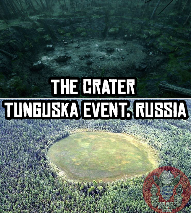 Τέλος ιδιαίτερα αξιοσημείωτο είναι το γεγονός ότι αυτή η περιοχή δεν αναφέρεται σε περιοχή των ΗΠΑ. Στο RDR2 εάν εξερευνήσετε το βόρειο τμήμα του Roanoke Ridge θα συναντήσετε έναν τεράστιο κρατήρα στο δάσος. Αυτός ο κρατήρας είναι μόλις το ένα τρίτο του μυστηρίου των Μετεωριτών στο RDR2 αλλά είναι ιδιαίτερα ενδιαφέρων γιατί αναφέρεται σε ένα φαινόμενο που συνέβη στην Σιβηρία! Το γνωστό ως «Tunguska Event». Ο κρατήρας στην πραγματικότητα είναι πολύ μεγαλύτερος και δημιουργήθηκε από έκρηξη μετεωρίτη στη Ρωσία το 1908